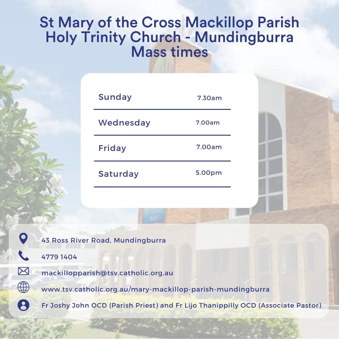 The St Mary of the Cross MacKillop Parish is centered on the Holy Trinity Church located at 43 Ross River Road, Mundingburra.