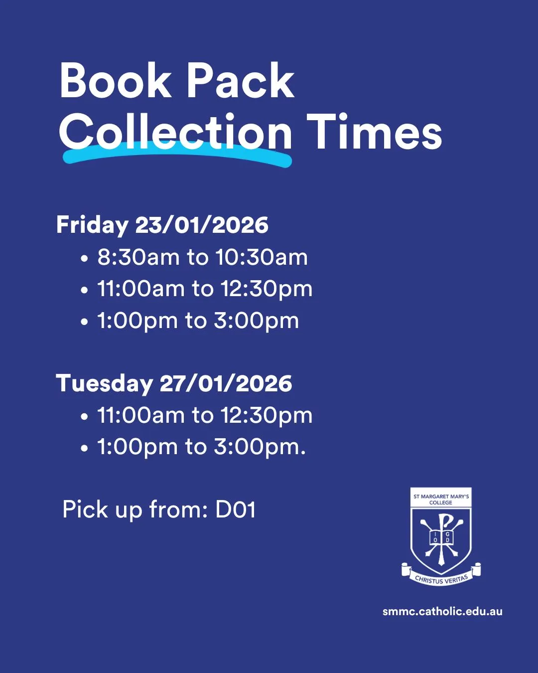 This year’s Book Packs will be available for collection on Friday 23 January and Tuesday 27 January.
